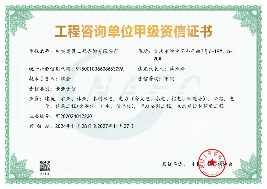 11月28日,中國工程咨詢協會發布《2024年第二批次工程咨詢單位甲級資信評價結果》公告,中實建設工程咨詢有限公司取得工程咨詢單位(市政公用工程、建筑工程、公路工程、生態建設與環境工程、農林業工程、水利水電工程、電力(含火電、核電、新能源)工程、電子信息(含通信、廣電、信息化)工···